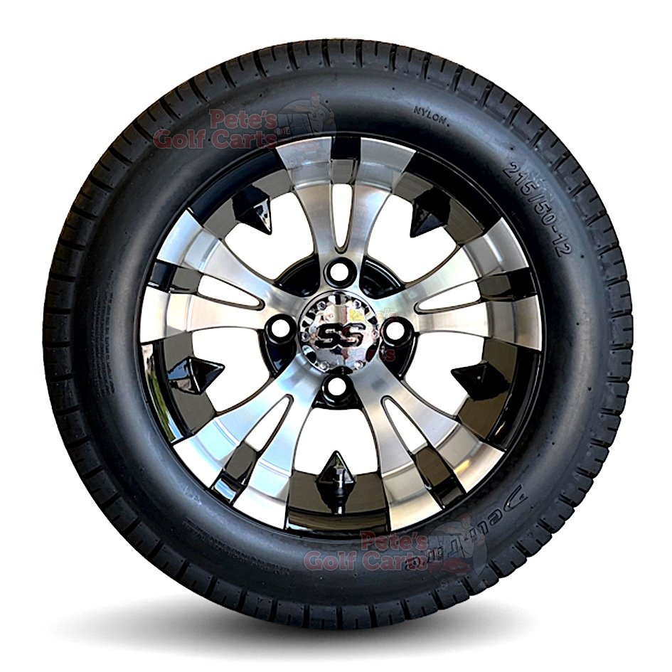 - 4 x 12″ Vampire Black/Machined Aluminum Golf Cart Wheels mounted on