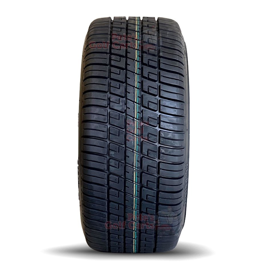 The 20.5″ tall tires (215/50-12) DOT Approved street tires can fit on your EZGO RXV, EZGO TXT, Yamaha G29 (Drive) and Yamaha Drive2 golf carts WITHOUT A LIFT KIT! Requiring a 3″ lift kit would be the Club Car Precedent, Club Car DS, and Yamaha G2-G22 models. Make sure you’re rear EZGO Rear leaf springs or Yamaha Coil springs are in good shape – especially if you have a golf cart rear seat kit with extra weight. Designed for applications like lawns, streets, golf courses, and paved paths – these tires feature a non-directional and quiet tread that will get you around town in no time.