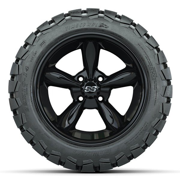 14″ Godfather Gloss Black Golf Cart Wheels and 22″ Tall GTW Timberwolf Tires Combo – Set of 4 – Includes Lug Nuts