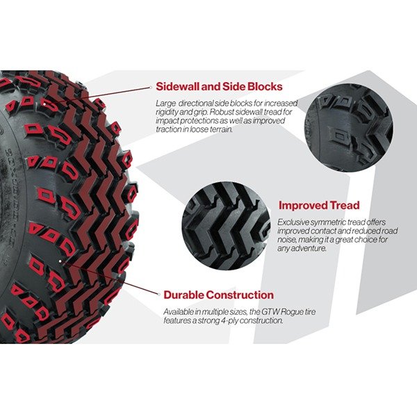 Meet the brand new 23″ all-terrain and off road golf cart tire by industry leader GTW! This new 23×10-14 Rogue tire and wheel set arrives mounted on 14″ Spyder Red/Black wheels – a perfect match for your golf cart dreams!
